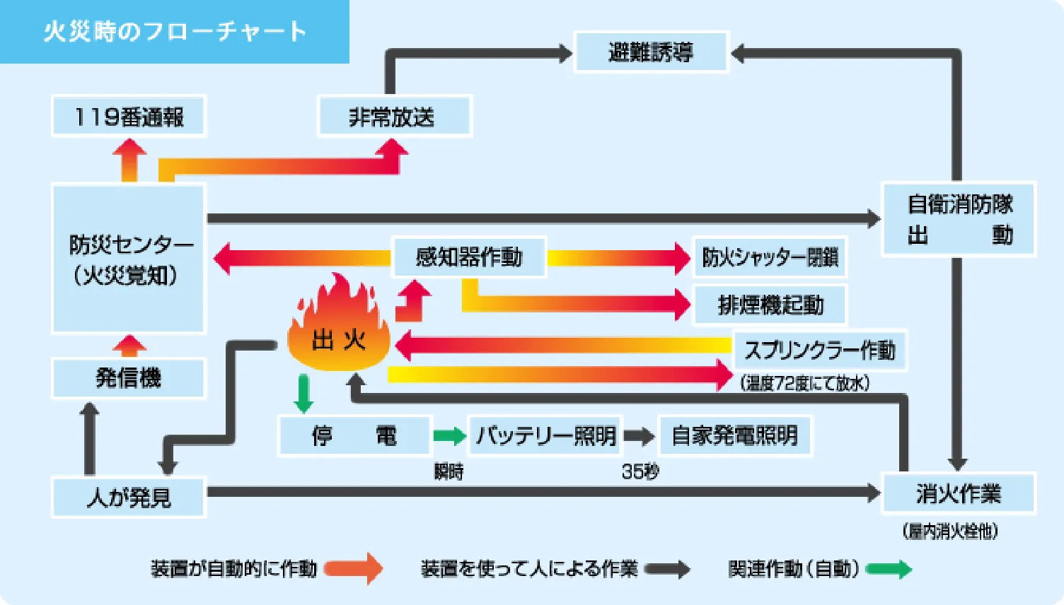 아래 그림의 플로차트는 방화 대책과 설비를 알기 쉽게 도해한 것입니다.화재가 발생했을 경우, 자동적으로 감지기가 작동하고, 동시에 스프링클러 설비에 의해 자동 산수 소화를 실시하는 한편, 배연기가 작동합니다.또한 방화 셔터(일부는 방화 방연 셔터)가 폐쇄되어 화재를 최소한으로 억제하여 피해가 커지는 것을 방지합니다.화재는 조기에 진압해, 지하가내의 사람들에게는 비상 방송이나 피난 유도로, 신속하게 안전한 장소로 이동해 주실 수 있도록, 시설의 정비나 훈련에 노력하고 있습니다.
