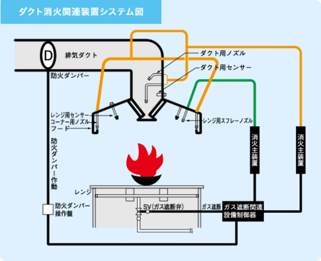 주방 푸드내 및 후드와 덕트의 접속부에 센서를 마련해, 후드내가 180°C가 되면 화재 전송 방지용 소화 장치(플라이어용, 레인지용)가 일해, 후드 아래에서 화재를 방지합니다