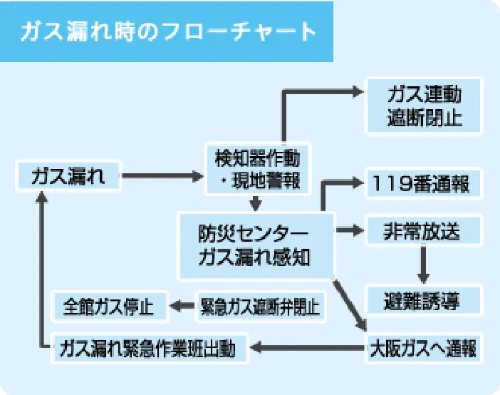만일 가스 누출이 있었을 경우는 각 점포마다 설치되어 있는 가스누출 검지기가 작동하여 경보를 발하는 것과 동시에 방재 센터에 통보하고 즉시 보안 담당자가 현장에 급행하여 처리합니다.또한 필요에 따라 오사카 가스, 소방서에도 전화로 통보되어 일반 고객님에 대해서는 비상 방송으로 알려, 피난 유도합니다.상황에 따라서는 긴급 차단 밸브를 조작하여 지하가의 가스 공급을 정지시키고 안전을 도모합니다.