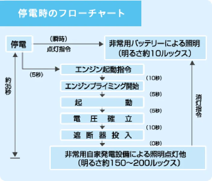 만일, 정전이 되었을 때는 자동적으로 그리고 순간에 비상 배터리에 의한 비상등이 점등(마루면 조도 평균 10룩스)해, 비상용 자가 발전 설비가 기동을 개시합니다.약 25초 후 시작이 완료되어 전압이 확립되고 10초 후 (정전 발생에서 약 35초 후)에는 평상 상태에 비해 1/4의 조도 (150 ~ 200 룩스)를 확보합니다.또, 이 자가 발전으로 화재시에 있어서의 방화 셔터, 소화 펌프, 배연기 및 배수 펌프 등의 방재 기기도 신속하게 운전 가능하게 됩니다.
